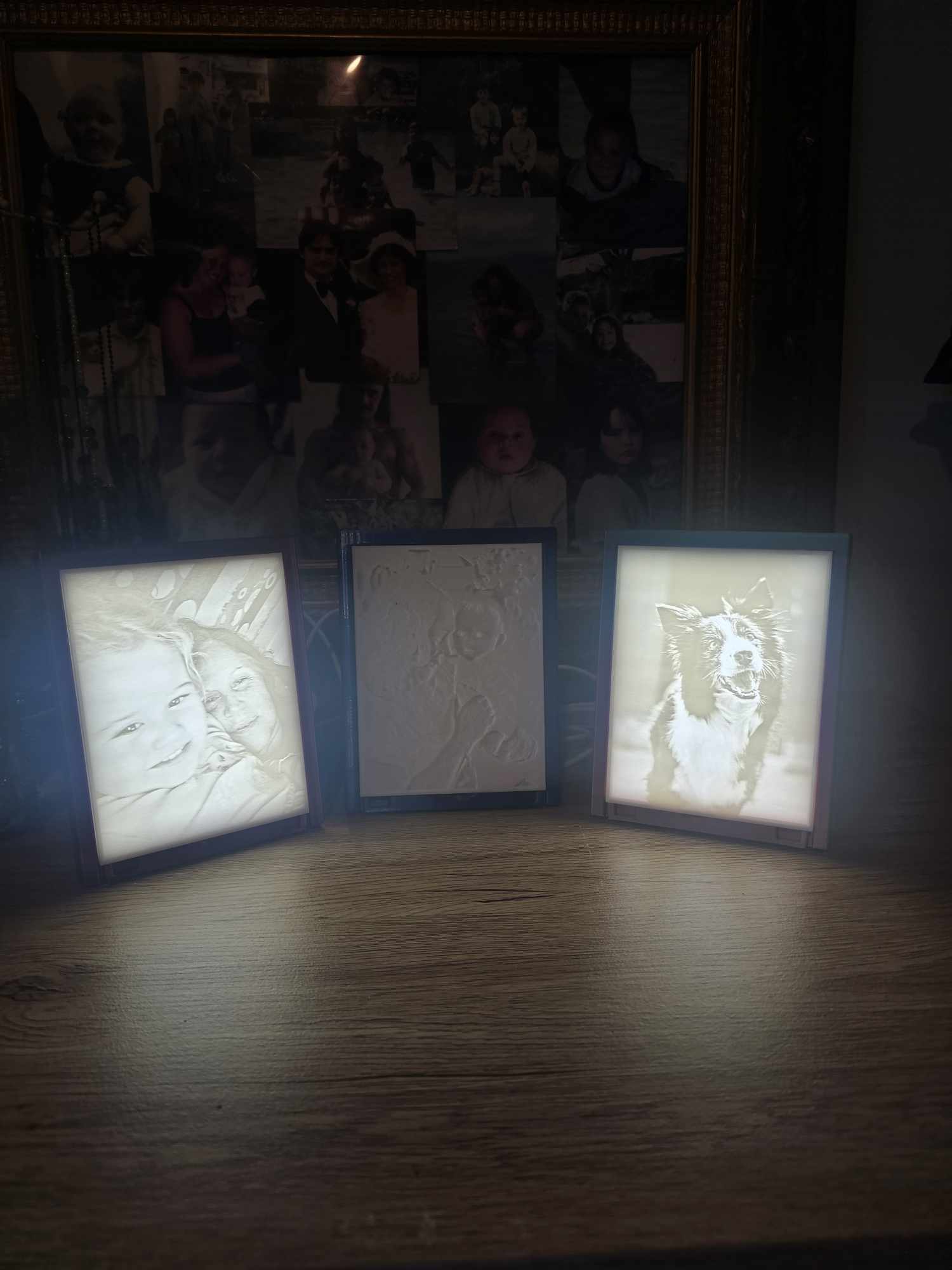 Illuminate your memories with a custom lithophane lightbox that transforms your favorite photos into captivating 3D art. Crafted to reveal intricate details when lit, this unique piece adds a mysterious glow and personal touch to any space. Perfect for creating a mesmerizing ambiance or a thoughtful gift that tells a story in light and shadow.